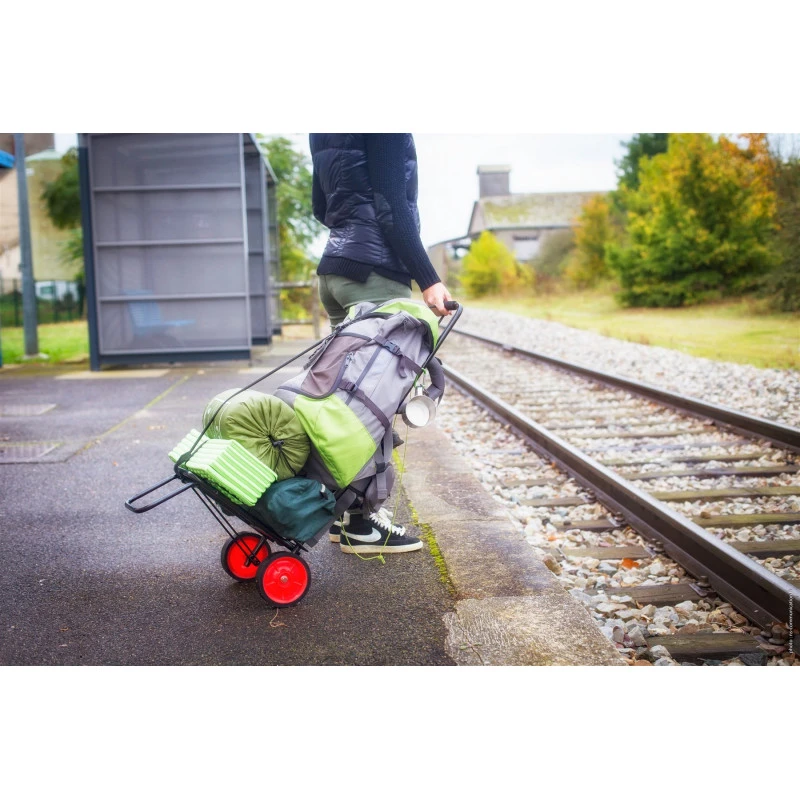 Accessoire camping, camping-car ou bateau de qualité, il offre un sandow de 1,38 m pour bloquer les bagages, 2 roues, un bras pliant et un plateau de portage surélevé et repliable.